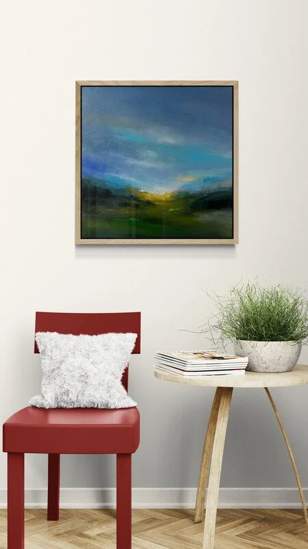 I think, to me, this painting represents a sunrise, featuring a delicate touch of almost lemon yellow just above the horizon with gentle light illuminating the foreground. Over time, I have created a number of these 30 x 30 cm stretched canvases as they are the perfect size to truly lose yourself in the experience without being so large that they take too long to complete. This size allows the work to maintain a similar style and feel to my smaller canvas paintings.