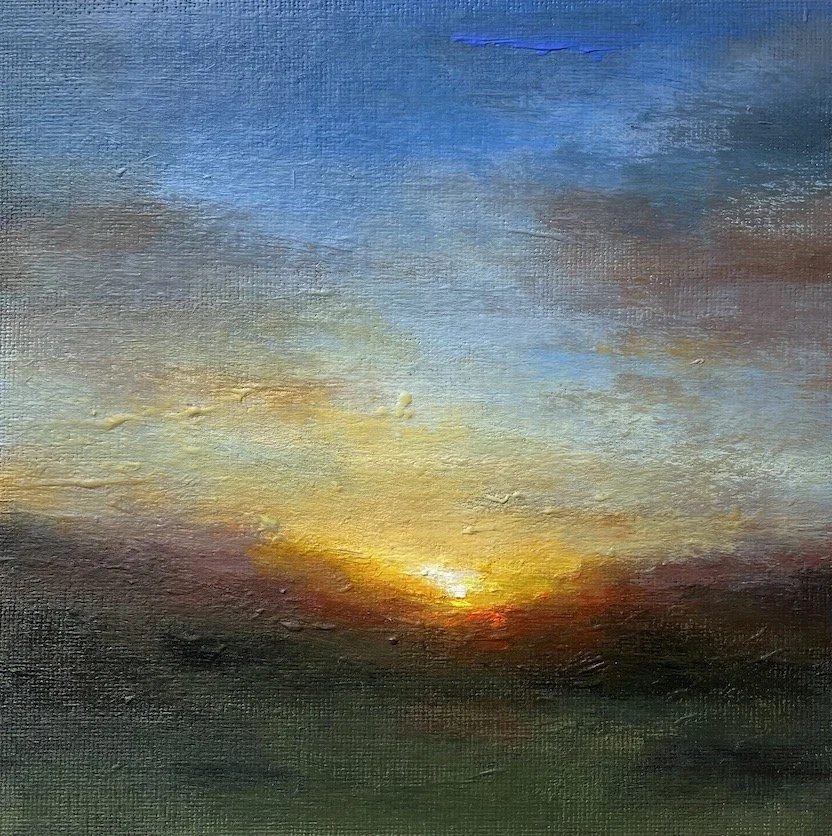 The light blues and gentle hints of orange peeking through the clouds create a soothing and gradual colour transition. The harmonious blend of colours and atmosphere has inspired me to begin working on a larger canvas, exploring a similar composition with a broader scale and depth.