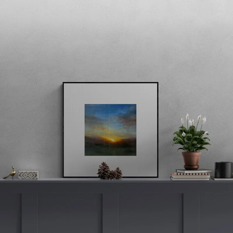 This painting is part of my new series of small sunset studies and is carefully rendered in my semi-abstract style using acrylic on canvas. I really enjoyed the process of painting this small landscape as it seemed to flow effortlessly and to be honest came together surprisingly quickly. Whilst some of my paintings go through many stages before I feel satisfied, this particular piece evolved so naturally and speedily.