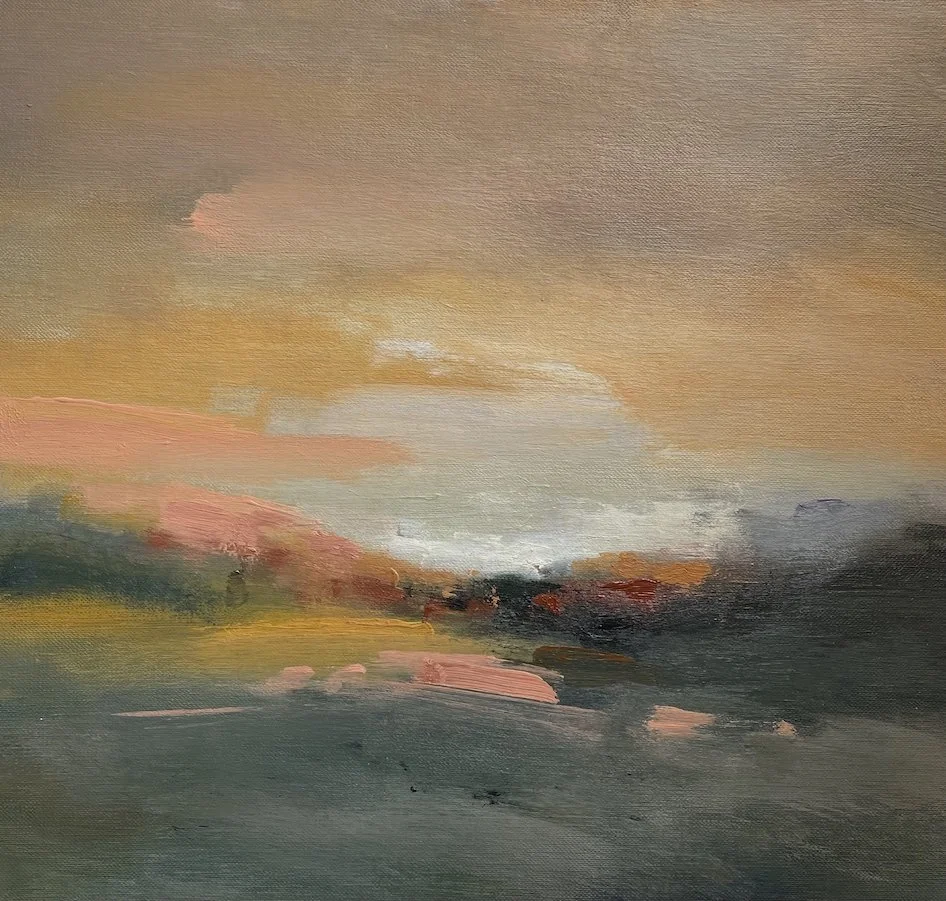 I love the touches of peachy orange tones and red brushstrokes on the horizon and the peach tones in the sky which pull the painting together.