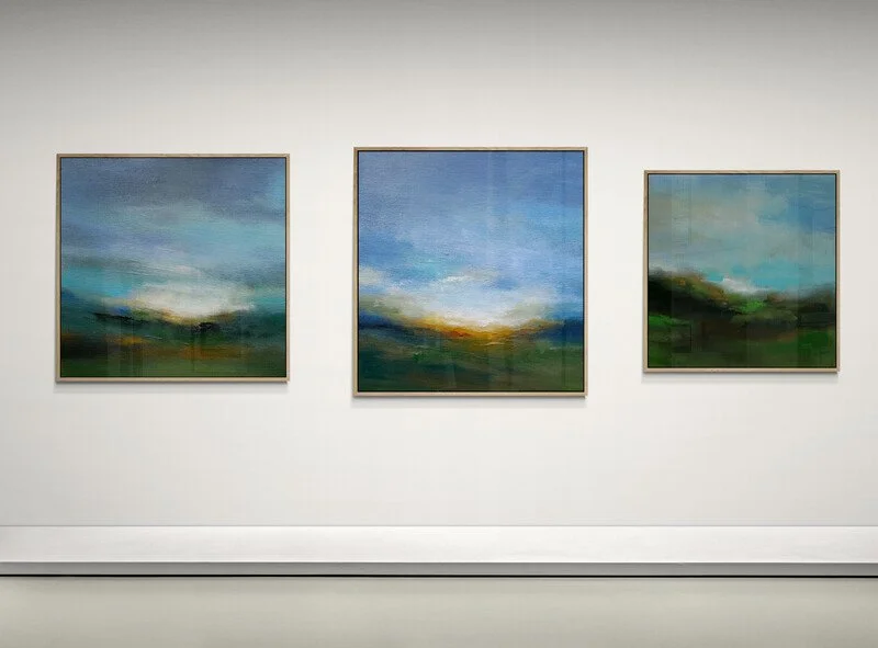 It’s always fascinating to observe how different paintings interact and complement each other, and I believe these three pieces harmonise beautifully, highlighting the delicate light on the horizon. Each was created with the North Downs firmly in mind. The North Downs is a landscape that continually draws me in for a variety of reasons, one of the most significant being sentimental. It was one of my late father’s favourite places, particularly the breathtaking views from Colley Hill, where the play of light and the richly coloured skies create a truly captivating atmosphere.