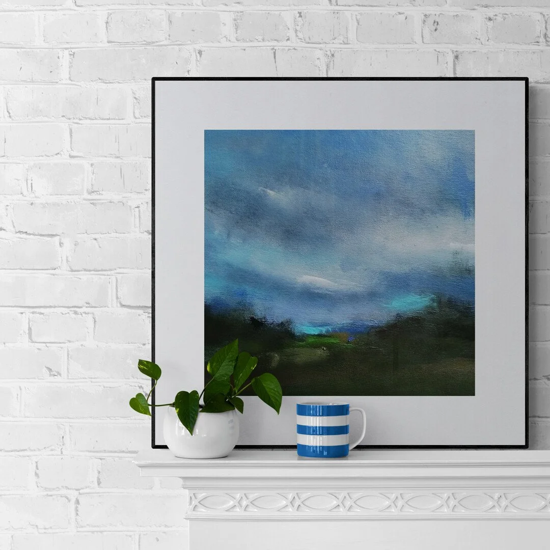 This painting is definitely more moody especially in the sky and therefore a little different than a lot of my smaller paintings, as they tend to be vivid in colour. In this painting the movement in the sky gives all the atmosphere with just a few flecks of white to give the impression of the light poking behind the clouds.