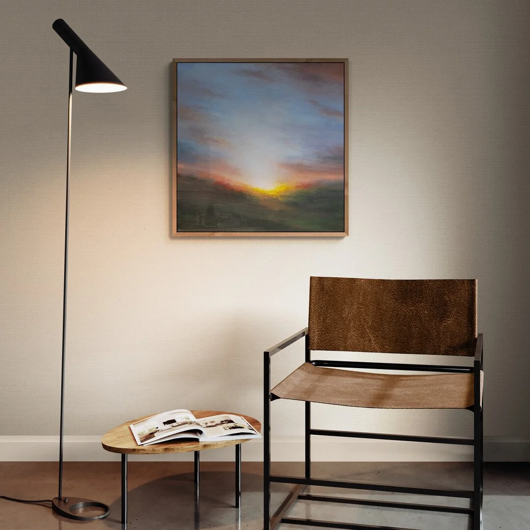 This luminous contemporary impressionist landscape would bring a serene yet invigorating presence to any room with soft, layered brushstrokes and a sophisticated palette of muted blues, warm creams and subtle ochres which create depth and light that move. A very easy to live with painting.